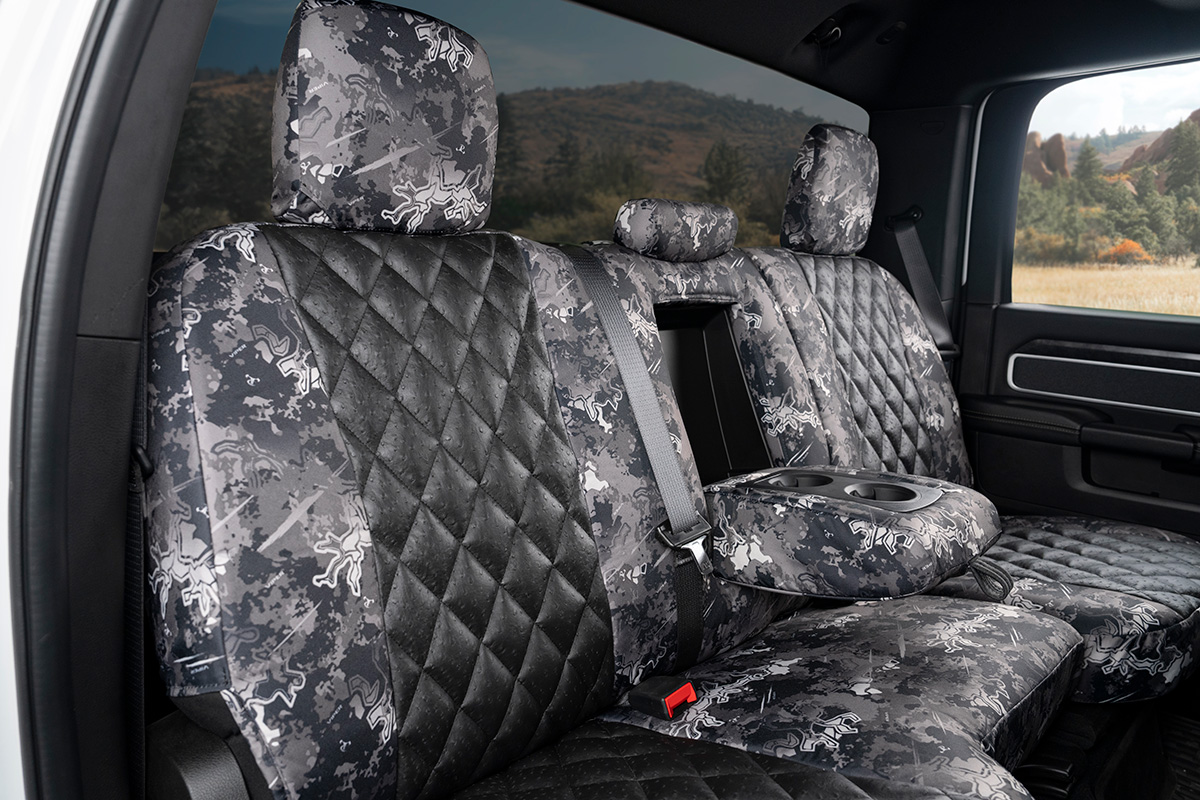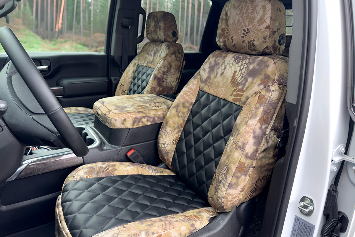 A quilted insert can be paired with a trim in a fabric not listed here, such as Camo, for a fully customized look.