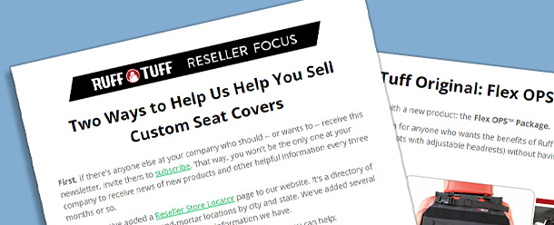 Our reseller newsletter is packed with valuable insights to help grow your business. From new product and fabric updates to practical tips and resources, you’ll find everything you need to boost your sales of Ruff Tuff Custom Seat Covers.